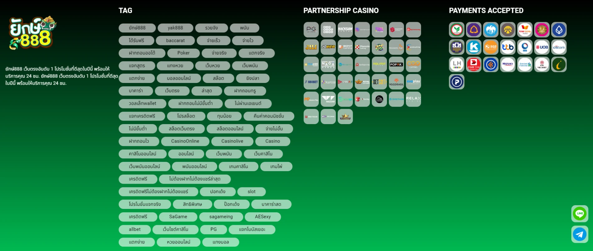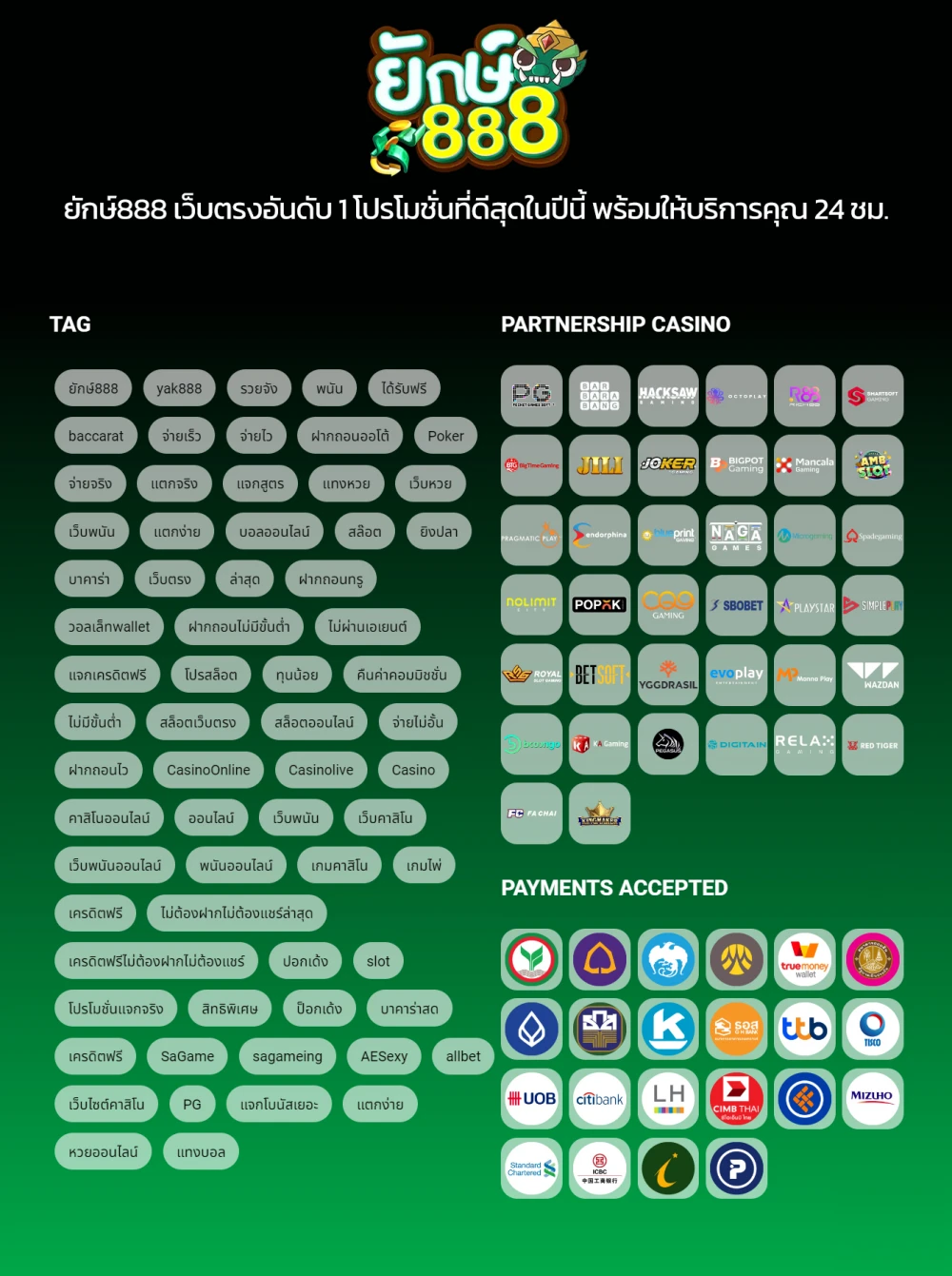 Yak888 (ยักษ์888) คือเว็บพนันออนไลน์ที่รวบรวมเกมคุณภาพจากค่ายดังทั่วโลกไว้ในที่เดียว ไม่ว่าจะเป็นสล็อต บาคาร่า หรือคาสิโนสด ผู้เล่นสามารถเข้าถึงได้ง่ายทั้งผ่านมือถือและคอมพิวเตอร์ โดยมีระบบที่ทันสมัยและปลอดภัยในฐานะ เว็บตรงไม่ผ่านเอเย่นต์ มั่นใจได้ว่าทุกการเดิมพันและการทำธุรกรรมมีความโปร่งใสและเชื่อถือได้